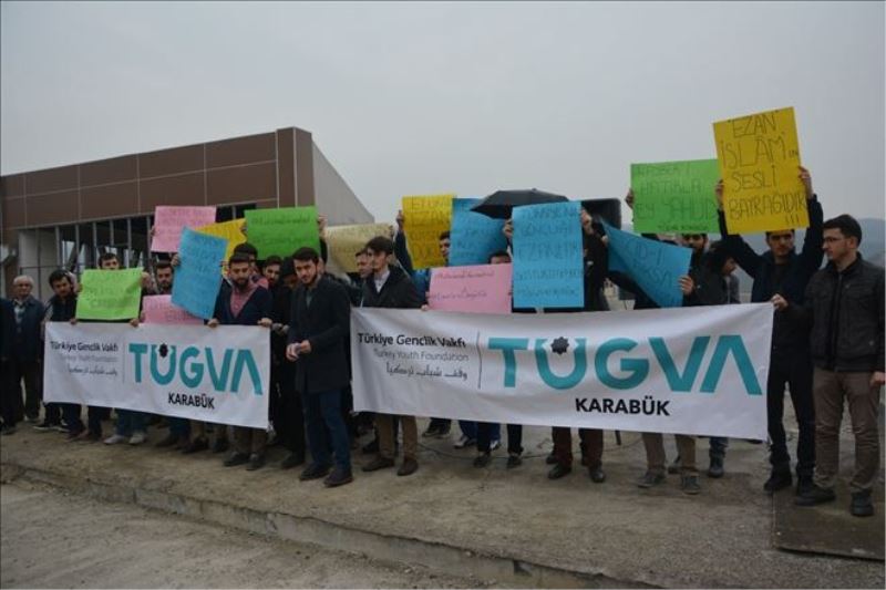 100. Yıl Mahallesi Pazar Yeri Camisi önünde toplanan yaklaşık 60 kişilik grup, ‘Ezan İslam´ın sesli bayrağıdır´, ‘Mescid-i Aksa onurumuzdur´, ‘Kutsalıma dokunma İsrail´, ‘Ezanlara özgürlük´, ‘Türkiye´nin gençliği ezanları susturmayacak´ yazılı dövizler açıp İsrail aleyhine sloganlar attı.
