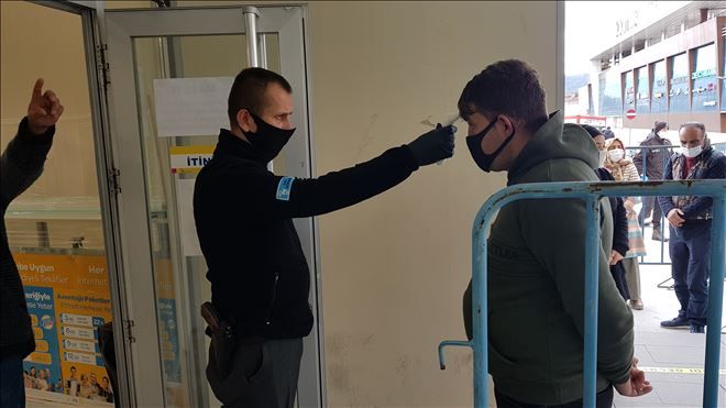Postane önünde bekleyen vatandaşlar içeriye ateşlerinin ölçülmesinin ardından alınıyor.