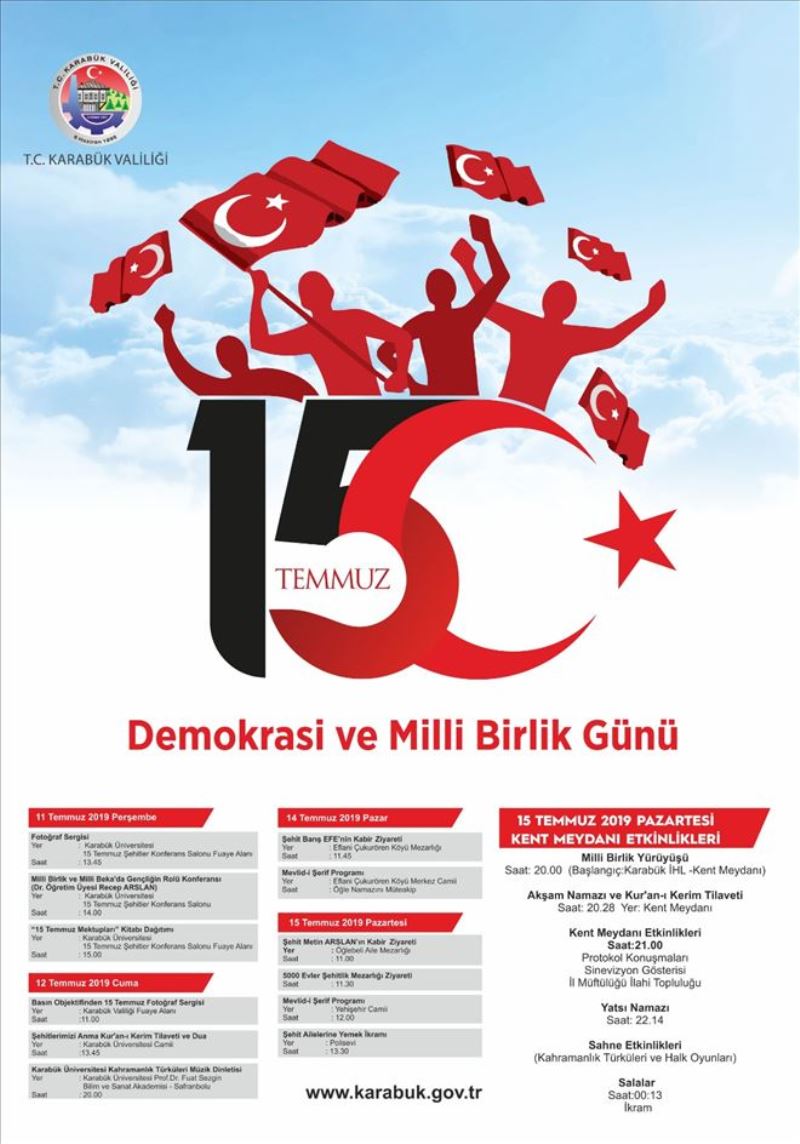 12 Temmuz Cuma günü saat 11:00´da Valilik Fuaye Alanında Basın Objektifinden 15 Temmuz Fotoğraf Sergisi, saat 13:45´de Karabük Ünivesitesi Camii´nde ŞehitlerimiAnma Kur´an-ı Kerim Tilivali ve Dua, saat 20:00´da Karabük Ünivesitesi Prof. Dr. Fuat Sezgin Bilim ve Sanat Akademisi- Safranbolu´da Karabük Ünivesitesi Kahramanlık Türküleri Müzik Dinletisi yapılacak.