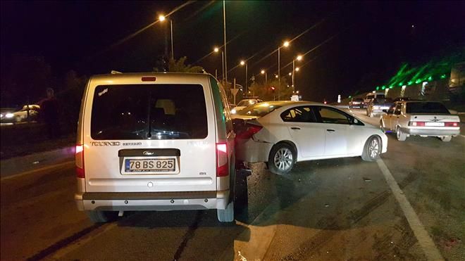 Yenişehir mahallesinde meydana gelen ilk kazada Naciye Özbek (46) idaresindeki 78 EA 421 plakalı otomobil sürücüsünün direksiyon hakimiyeti kaybetmesi sonucu Mithatpaşa Caddesi Gülistan Sokak üzerinde tek katlı bir lojmanın demir kapısını kırarak evin balkonuna çarparak durdu. Kazada otomobilin kadın sürücüsü Naciye Özbek yaralanırken, evde bulunan Nagihan İpek ise kazanın şiddeti ile panikleyerek şoka girdi.