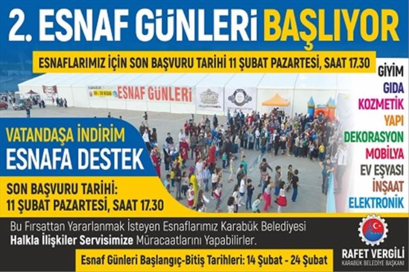 14-24 Şubat tarihleri arasında Karabük Kent Meydanında düzenlenecek olan 2. Esnaf Günleri etkinliği için esnafların son başvuru tarihi 11 Şubat Pazartesi günü saat 17.30´a kadardır. Esnaflar için müracaatlar Karabük Belediyesi Halkla İlişkiler Merkezi Kat 2´ye yapılacaktır.