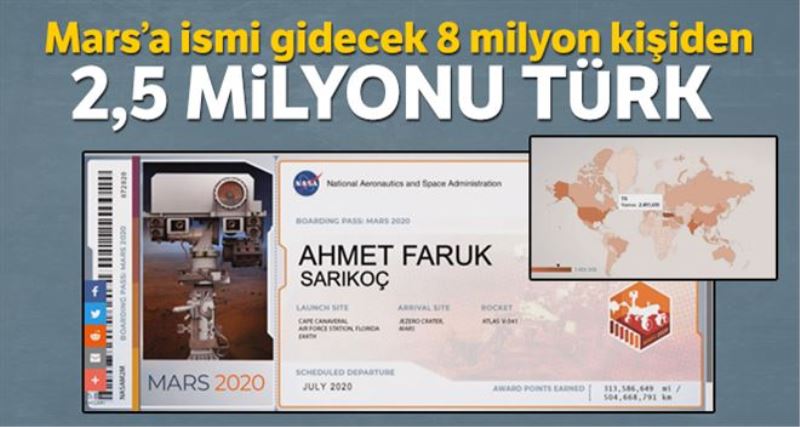 Amerikan Ulusal Havacılık ve Uzay Dairesi (NASA), 2020 yılında Güneş sistemindeki en yakın komşumuz olan Mars´a yeni bir Rover uzay aracı gönderecek. Uzay meraklılarını bu görevin içine isimleri ile dahil etmek isteyen NASA, Send Your Name to Mars (İsmini Mars´a Gönder) adlı bir kampanya başlattı. Bu kampanya sayesinde hazırlanan web sayfasını ziyaret edenler formu doldurduktan sonra isimleri gidecek uzay aracının içine yerleştirilecek olan çipe yazılacak. Formun doldurulmasından sonra 2020´deki Mars görevi için temsili bir biniş kartı veriliyor. Dünya çapında 7 milyon 987 bin kişi ´İsmini Mars´a Gönder´ kampanyasına katıldı. En yüksek katılımı sağlayan ülkeler arasında Türkiye ise birinciliğini koruyarak 2 milyon 495 bin kişi ile katılım gösterdi. Türkiye´nin yüksek katılım göstermesi ise sosyal medyada en çok konuşulan konular arasında yer aldı. ABD´nin Türkiye Büyükelçiliği resmi Twitter hesabından “2020 Mars yolculuğuna adını yazdıranlar arasında Türkiye 2,5 milyona yaklaşan isim kaydıyla dünya sıralamasında ilk sırada! Türkiye bu konuda rekora imza atsın istemez misin?” diye paylaşımda bulundu.