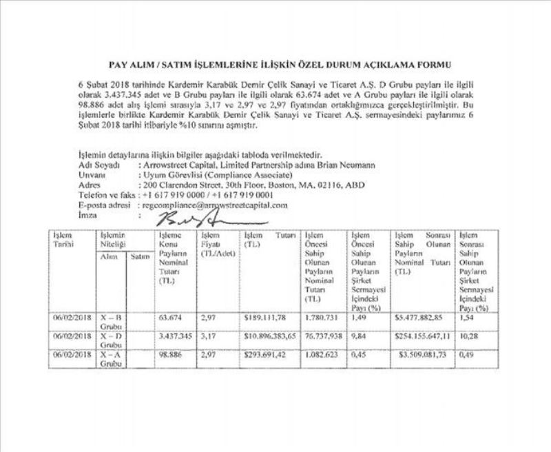 Kamuyu Aydınlatma Platformu (KAP)´a Amerika´nın Boston eyaletine bağlı Arrowstreet Caiptal, Limited Partnership adına Brian Neumann adından yapılan açıklamada, 6 Şubat 2018 tarihinde Karabük Demir Çelik Snaayi ve Ticaret AŞ. D grubu paylarından 3.17 TL´den 3 milyon 437 bin 345 adet, 2.97 TL´den 63 bin 674 adet B grubu payı ile yine 2.97 TL´den 98 bin 886 adet A gurubundan alım işlemi ortaklığımızca gerçekleştirilmiştir” denildi.