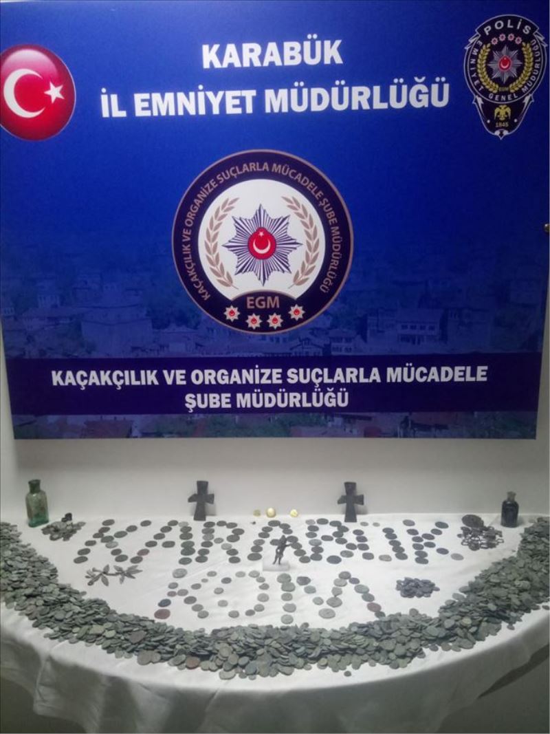 Karabük´te tarihi eser kaçakçılığı yaptığı iddia edilen Y.Ç. polisin düzenlediği operasyonu ile yakalandı. Y.Ç.´nin evinde yapılan aramada Helenistik, Bizans, Roma ve değişik dönemlere ait değişik ebatlarda 23 metal parça, üzerlerinde ibareler okunamayan 23 ince metal parça, üzerlerinde çeşitli simgeler olan 3 altın görünümlü sikke, 1 yüzük, değişik ebatlarda 21 sikke, değişik ebatlarda ok ucuna benzer 8 metal parça, çeşitli şekillerde 5 kolye ucu, yüzük benzeri 16 metal parça, 20 metal parça, gümüş görünümlü üzerlerinde çeşitli şekiller bulunan 38 metal parça, üzerlerinde değişik şekiller bulunan 2 haç, değişik boyutlarda üzerlerinde simgeler bulunan 90 sikke, değişik boyutlarda 85 metal parça, 1 yeşil renkli cam şişe, 1 bordo renkli cam şişe, 1 kadın figürlü metal heykel, değişik ebatlarda 40 sikke, gümüş renkli üzerinde figür olan küçük 1 metal parça, değişik boyutlarda üzerlerinde değişik figürler bulunan 4 bin 201 sikke olmak üzere toplamda 4 bin 580 tarihi eser ele geçirildi.
