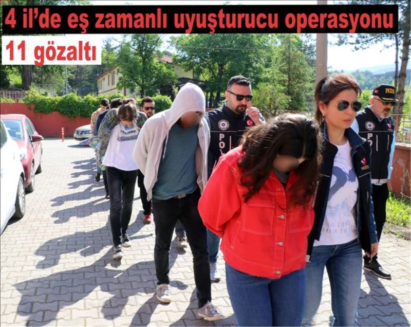 Karabük Narkotik Suçlarla Mücadele Şube Müdürlüğü ekipleri tarafından uyuşturucu madde temin ve ticaretinin önlenmesine yönelik yapılan çalışmalar kapsamında Karabük merkezli, İzmir, Kocaeli ve Muğla´da eş zamanlı operasyon yapıldı. Karabük ve Safranbolu´da gözaltına alınan şahsıların ifadeleri doğrultusunda çalışmalarını genişleten Narkotik timleri İzmir, Kocaeli ve Muğla´nın Bodrum ilçesinde eş zamanlı yapılan operasyon kapsamında 1´i kadın toplam 11 kişiyi gözaltına aldı.