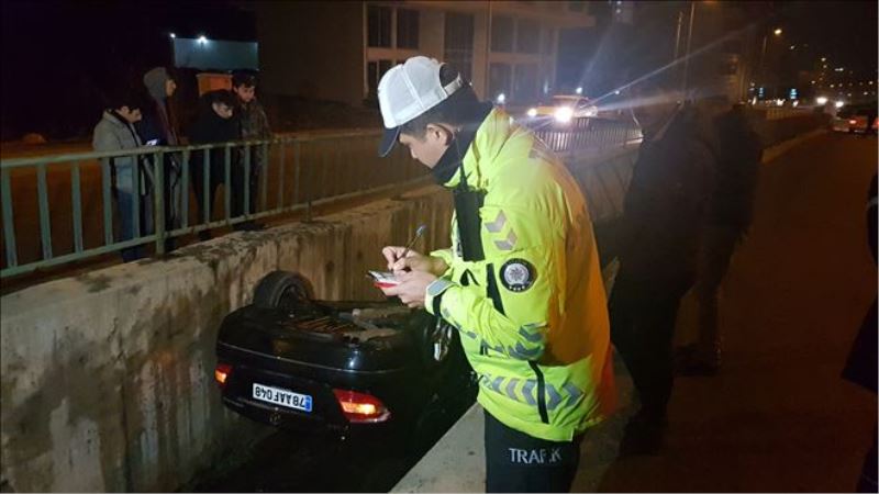 Edinilen bilgiye göre, M.E. yönetimindeki 78 AAF 048 plakalı otomobil, Ergenekon Mahallesi Konut Sitesi yolu üzerinde sürücüsünün virajı döndükten sonra direksiyon hakimiyetini kaybetmesi yolu ayıran su kanalına düşerek devrildi. Çevredekilerin ihbarı üzerine olay yerine 112 Acil Servis, polis, itfaiye ve AFAD ekipleri sevk edilirken sürücü, kendi imkanlarıyla otomobilden çıktı. Polis ekiplerinin yaptığı kontrollerde sürücü 2.80 promil alkollü çıktı.