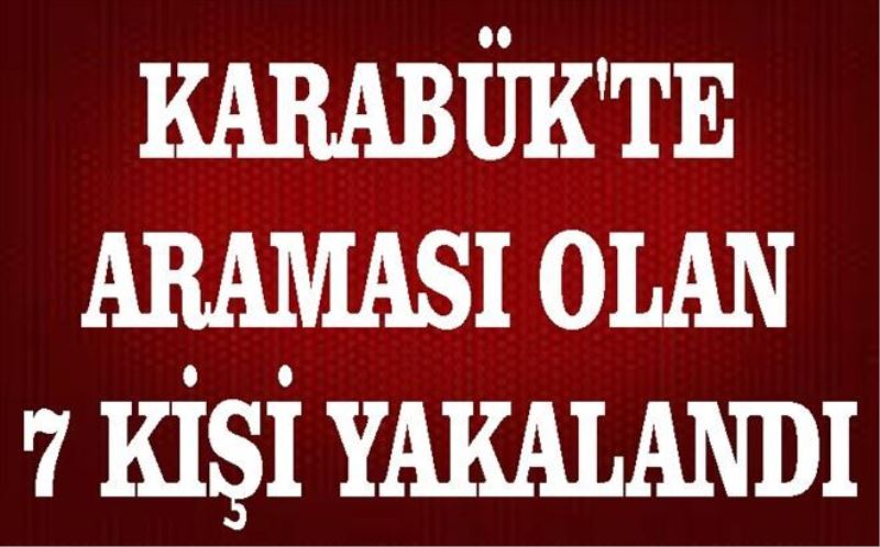 Karabük Emniyet Müdürlüğü Asayiş Şube Müdürlüğü ekiplerinin çalışmaları neticesinde; 5411 Sayılı Kanuna Muhalefet, ruhsatsız ateşli silahlarla mermileri satın alma, taşıma veya bulundurma, vergi usul kanununa muhalefet, basit yaralama suçlarından aranan 7 şahıs yakalandı. Yakalanan şahıslardan ikisi çıkarıldıkları adli makamlarca tutuklanarak Karabük T tipi Ceza İnfaz Kurumu´na teslim edildi.