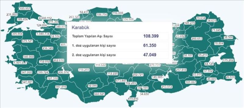 Sağlık Bakanlığı verilerine göre, Karabük´te, 61 bin 350 adet birinci doz aşı, 47 bin 49 adet ikinci doz aşı uygulanırken toplam aşı sayısı 108 bin 399´u buldu. Kastamonu´da 102 bin 275 birinci doz, 84 bin 481 ikinci doz olmak üzere 186 bin 756 doz aşı uygulandı. Bartın´da 51 bin 992 birinci doz, 40 bin 509 ikinci doz olmak üzere 92 bin 431 doz aşı uygulandı. Bolu´da 80 bin 219 birinci doz, 62 bin 645 ikinci doz olmak üzere 142 bin 864 doz aşı uygulandı. Zonguldak´ta 148 bin 245 birinci doz, 115 bin 78 ikinci doz olmak üzere 263 bin 323 doz aşı uygulandı.