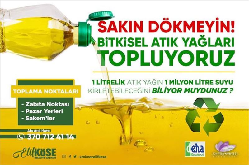 Bitkisel atıkları toplamak üzere bir firma ile anlaştıklarını ifade eden Başkan Köse; “ Safranbolulu vatandaşlarımızdan rica ediyoruz, lütfen bitkisel yağları lavabolardan dökmeyip biriktirsinler. Biriken yağları tüm SAKEM´ler, Pazar Yerleri ve Zabıta Noktasında bulunan Mavi Bidonlara boşaltabilirler. Ya da Alo Atık Hattı 712 41 14 nolu telefonden bizlere ulaşabilirler. 1 litrelik atık yağın 1 milyon litre suyu kirlettiğini düşünürsek, bu konuya tüm Safranbolu olarak sahip çıkmamızın daha da önemli olduğu anlaşılacaktır. Çevre kirliliğine el birliği ile son vermemiz gerekiyor. Korumanın Başkenti unvanına sahip bu şehir bunu başaracaktır. Daha önce de belirttiğimiz gibi amacımız gelecek kuşaklara çok daha yaşanılır bir kent bırakmak. Şimdiden tüm hemşerilerime verecekleri katkılardan dolayı teşekkür ediyorum” dedi.