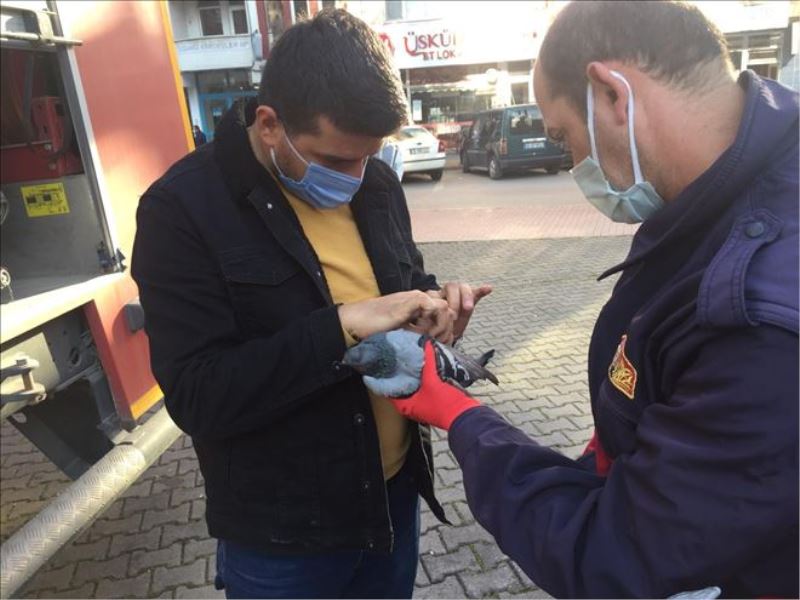 Ağaçtan indirilen güvercin, ayağına dolanan ipten kurtarılması sonrası itfaiye ekipleri tarafından doğaya salındı.