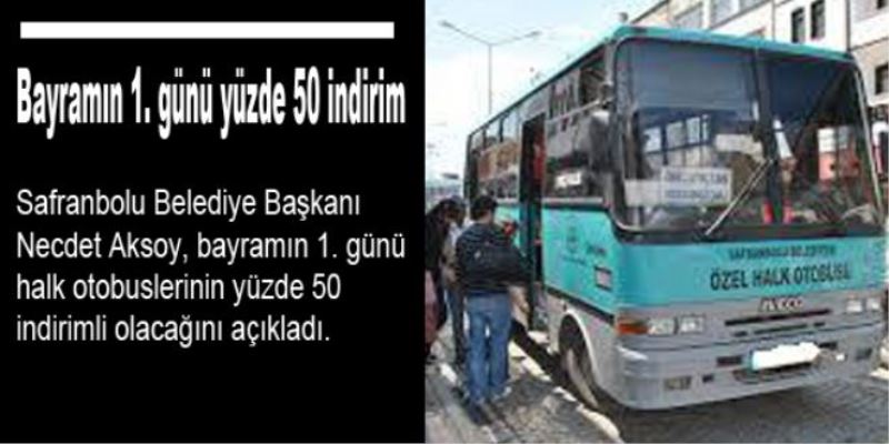 Safranbolu Belediye Başkanı Necdet Aksoy, yaptığı açıklamada, bayramın 1. günü toplu ulaşım araçlarında yüzde 50 indirim kararı alındığını belirterek, vatandaşların sorunsuz bir bayram yaşaması için de tüm önlemlerin alındığını söyledi. Aksoy, Ramazan Bayramı’nda Safranbolululuların daha az fiyatlarla ulaşımı olanağı yapabilmeleri için Bayramın 1. günü toplu ulaşım araçlarında yüzde 50 indirim uygulanacağını, yine Arife günü saat 10.00’dan itibaren Köyiçi mevkiinden mezarlığa her yarım saatte bir ücretsiz araç kaldırılacağını kaydetti.