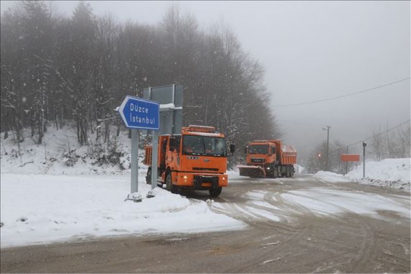 Düzce´de öğle saatlerinde başlayan kar yağışı, D-100 karayolu Bolu Dağı kesiminde etkisini sürdürüyor. Yüksek kesimleri beyaz örtüyle kaplayan kar yağışı, D-100 karayolunun Yumrukaya, Abant Kavşağı, Elmalık, Bakacak, Seymenler, Karanlıkdere, Bıçkıyanı, Sarıçökek bölgeleri ile Bolu Dağı Tüneli´nde şiddetini artırarak devam ediyor. Yeşil alanlarda kar kalınlığının 50 santimetreyi bulduğu Bolu Dağı mevkiinde küreme ve tuzlama çalışmalarını aralıksız sürdüren karayolları ekipleri, güzergahların önemli kısımlarında hazır olarak bekletiliyor. Sürücüler, yağış ve gizli buzlanma nedeniyle ışıklı tabelalar ve polis ekipleri tarafından hız yapmamaları ve takip mesafelerini korumaları yönünde uyarılıyor.