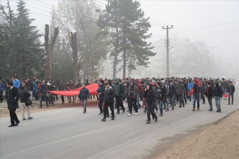 Daha sonra Vali Baruş ve diğer katılımcılar tarafından dev Türk Bayrağı eşliğinde Kültür Camii´nden Şehitler Mezarlığı´na kadar yüründü. Mezarlıkta konuşma yapan Gençlik Hizmetleri ve Spor İl Müdürlü Şahin Ertem, binlerce kefensiz şehidin yattığı Çanakkale´de yazılan eşsiz destanın çok büyük anlam ifade ettiğini vurgulayarak şunları söyledi: