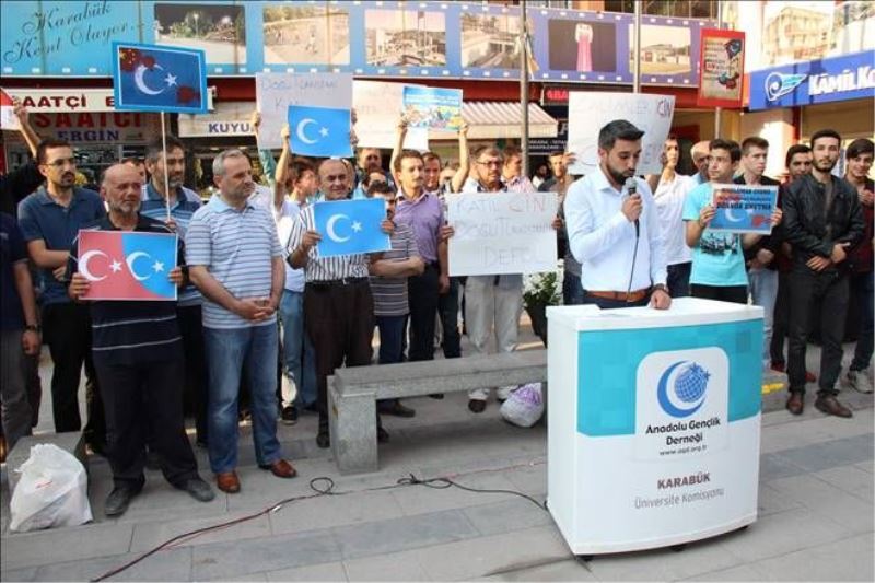 Karabük Belediyesi AGD üyeleri, 'Zalimler için yaşasın cehennem', 'Müslüman uyuma, Doğu Türkistanlı kardeşlerini duanda unutma' ve 'Güneşin doğduğu yerde kardeşin kan ağlıyor, görmüyor musun Müslüman' yazılı dövizler taşıyarak, Çin aleyhine slogan attı.