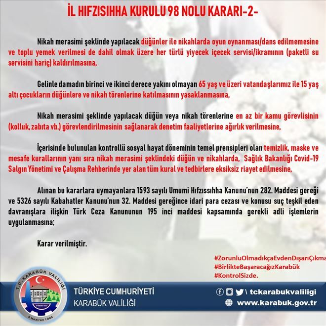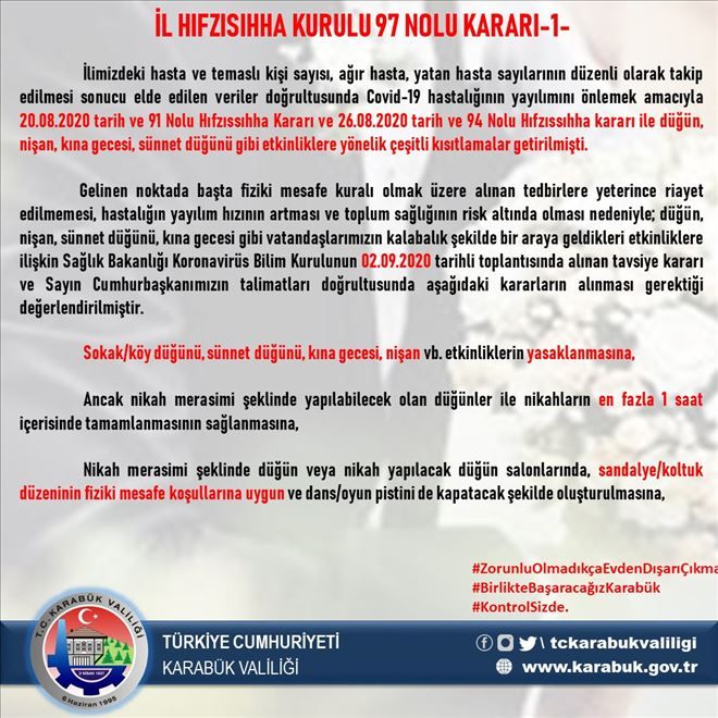 Karabük İl Hıfzıssıhha Kurulu Karabük´te ki hasta ve temaslı kişi sayısı, ağır hasta, yatan hasta sayılarının düzenli olarak takip edilmesi sonucu elde edilen veriler doğrultusunda Covid-19 hastalığının yayılımını önlemek amacıyla 20.08.2020 tarihi ve 91 Nolu Hıfzıssıhha Kararı ve 26.08.2020 tarih ve 94 Nolu Hıfzıssıhha kararı ile düğün, nişan, kına gecesi, sünnet düğünü gibi etkinliklere yönelik çeşitli kısıtlamalar getirildiğini duyurdu.