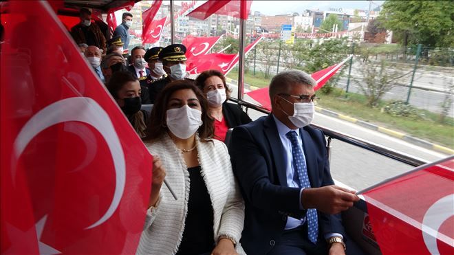 Karabük Kent Meydanı´ndaki etkinliklerin ardından Vali Gürel ve protokol üyeleri Ankara Büyükşehir Belediyesine ait üstü açık otobüse binerek marşlar eşliğinde şehir turu attı.