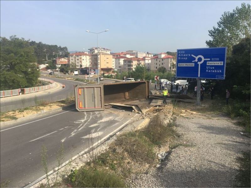 Kaza, Sinop-Karabük kavşağında meydana geldi. Edinilen bilgilere göre 49 yaşındaki Dursun Cemal Özcan´ın idaresindeki hurda demir yüklü Volvo marka tır, Türbe kavşağından Sinop-Karabük kavşağına seyir halindeyken kontrolden çıkarak kaldırıma çarpıp devrildi. Kazada tır sürücüsü Dursun Cemal Özcan yaralandı. Kazayı gören vatandaşların ihbarı üzerine bölgeye 112 ve polis ekipleri sevk edildi. Sürücü Özcan, 112 ekiplerinin ilk müdahalesinin ardından ambulansla Bartın Devlet Hastanesine kaldırıldı.