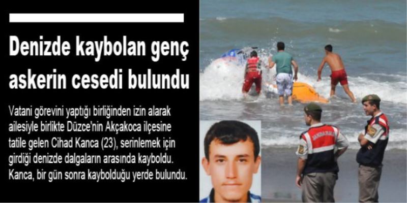 Ankara`da askeri basımevinde vatani görevini yapan piyade çavuş Cihad Kanca birliğinden izin alarak memleketi Karabük`e geldi. Cihad Kanca dün ailesi ve akrabalarıyla birlikte tatil için Akçakoca Melenağzı mevkisinde bir otele tatile geldi. Cihad Kanca öğle saatlerinde teyzesinin oğlu 18 yaşındaki Emre Karakırık ile birlikte denize girdi. Ayağına kramp girdiğini söyleyen Cihad Kanca, Emre Karakırık`tan yardım istedi. Emre Karakırık yardıma gittiği sırada Cihad Kanca dalgaların içerisinde kaybolurken, yakınları yardım istedi. Sakarya`nın Karasu ilçesi ve Akçakoca`dan jet ski ile gelen görevliler arama yaparken, daha sonra Düzce İl Afet ve Acil Durum Müdürlüğü sahil güvenlik ve jandarma ekipleri denizde ve sahil boyunca arama yaptı.