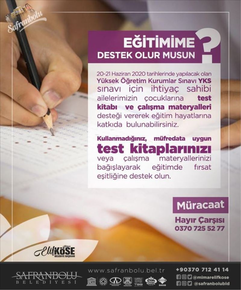 Safranbolu Belediye Başkanı Elif Köse´nin talimatı ile başlatılan kampanya kapsamında 20-21 Haziran 2020 tarihinde yapılacak olan YKS sınavı için ders kitapları ve çalışma materyalleri toplanarak ihtiyaç sahibi öğrencilere destek olunması amaçlanıyor.