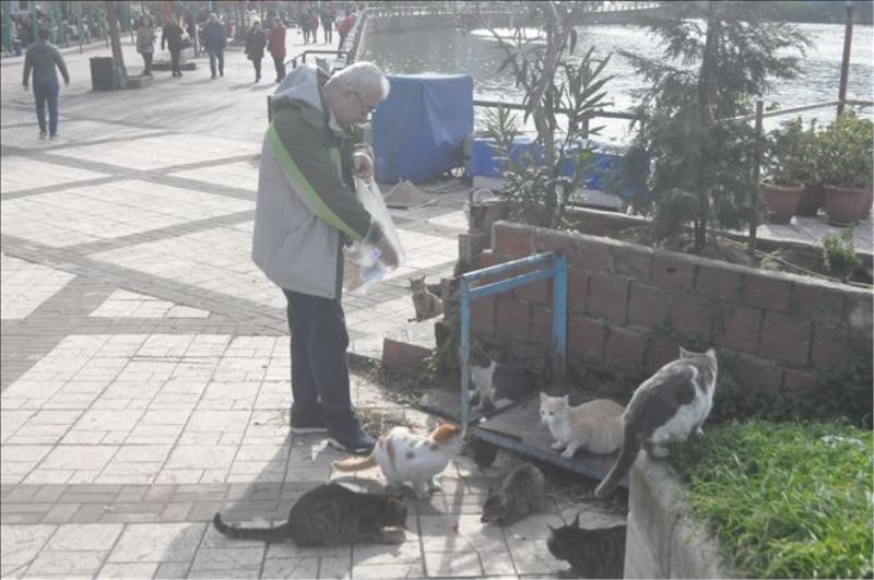 Zonguldak´ta emekli vatandaş sokak kedilerine sahip çıkmak amacıyla marketten aldığı yiyecekleri kordon boyuna getirerek kedileri besliyor.