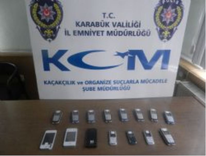 Karabük İl Emniyet Müdürlüğü Kaçakçılık ve Organize Suçlarla Mücadele Şube Müdürlüğü tarafından kaçakçılık olayları ile ilgili yapılan operasyonda; M.N.Ç (37) içerisinde kaçak cep telefonlarının bulunduğu çantayla yakalandı. Şüphelinin çantasında yapılan aramada; 9 adet Nokia marka 1110i model, 1 adet Apple Iphone marka F8 model, 1 adet Apple marka Iphone model, 3 adet Nokia marka Mini 5130 model, 1 adet Samsung marka Wave model olmak üzere toplam 15 cep telefonu ele geçirildi.