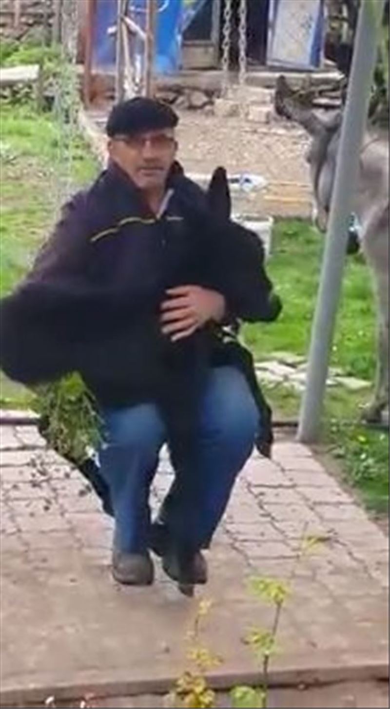 Karabük´ün Safranbolu ilçesinde yaşayan 60 yaşındaki Ali Kavsa, evinin bahçesinde bulunan salıncağa 'Kara kızan' adını verdiği sıpasıyla bindi. Kara kızanı kucağına alan Ali Kavsa bir süre salıncakta sallandı. Ali Kavas, 'İki gündür binemediği salıncağa bugün biniyoruz' dedi.