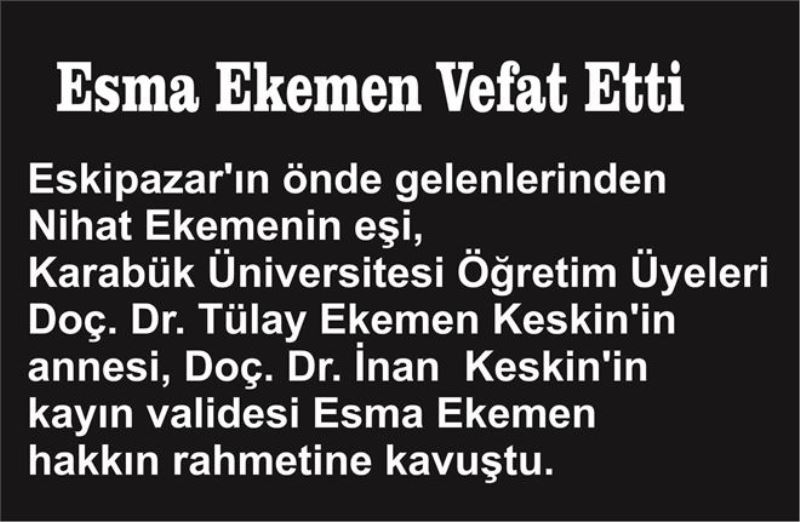 Merhuma Yüce Allah´tan rahmet, başta Karabük Üniversitesi Öğretim Üyeleri Doç. Dr. Tülay Ekemen Keskin ve Doç. Dr. İnan Keskin olmak üzere merhumun ailesine ve sevenlerine başsağlığı dileriz.