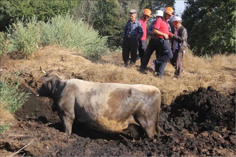 Edinilen bilgiye göre, Kozlu Köyü´nde bulunan ormanlık alanda dolaşan Nizamettin Tekin´e ait inek tavuk gübrelerinin döküldüğü yere battı. İneğinin gübrelerin içinde kaldığını gören Tekin, traktörünün arkasına taktığı kepçeyle ineğinin kurtarmaya çalıştı. Diğer köylülerle birlikte gübreye batan ineğini kurtaramayan Nizamettin Tekin, itfaiye ekiplerinden yardım istedi. Olay yerine gelen ekipler ve traktör yardımıyla inek battığı yerden çıkarıldı.