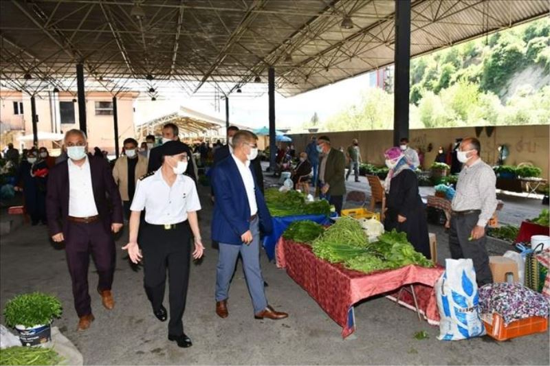 Karabük Valisi Fuat Gürel beraberindeki protokol üyeleri ile birlikte Covid-19 tedbirleri kapsamında kurulan pazar alanlarını ziyaret etti.