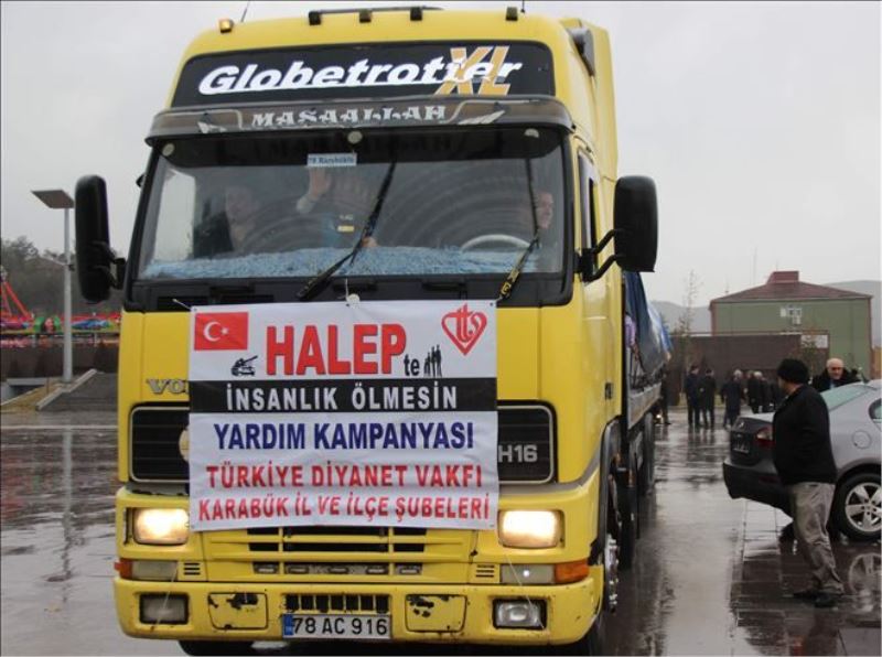 Diyanet Vakfı Karabük il ve ilçe şubelerince gerçekleştirilen Halep´e yardım kampanyası kapsamında toplanan 27 ton gıda maddesi, 700 adet battaniye, 2 bin 500 adet elbise, 700 çift ayakkabı, 30 koli temizlik maddesi tırlara yüklendi.