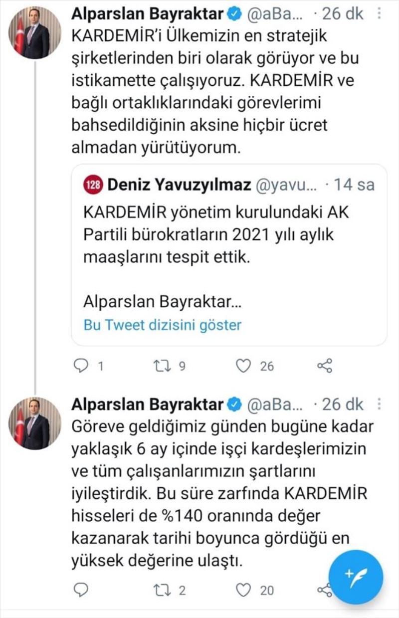 CHP Zonguldak Milletvekili Deniz Yavuzyılmaz, Enerji ve Tabii Kaynaklar Bakan Yardımcısı Alparslan Bayraktar´ın KARDEMİR ve KARDÖKMAK Yönetim Kurulu Başkanlığındaki görevleri ile birlikte 77 bin 140 TL iddia etmişti. Milletvekili Yavuzyılmaz´ı yalanlayan KARDEMİR Yönetim Kurulu Başkanı Alparslan Bayraktar iddialara sosyal medya hesabı üzerinden cevap verdi.