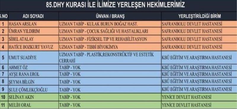 Doktor atamalarının ardından açıklama yapan AK Parti Karabük İl Başkanı Av. İsmail Altınöz, “ Milletvekillerimiz Cumhur Ünal ve Niyazi Güneş, AK Parti Karabük Belediye Başkan Adayımız Prof. Dr. Burhanettin Uysal´ın girişimleri üzerine Karabük ilimize 85. DHY Kurası ile KBÜ Karabük Eğitim ve Araştırma Hastanemize 1 Uzman Tabip ve 4 Tabip, Safranbolu Devlet Hastanemize 4 Uzman Tabip ve Yenice Devlet Hastanemize 2 Tabip Ataması Yapılmıştır. Yeni göreve başlayan doktorlarımıza başarılar dilerim. Karabükümüze hayırlı olsun.” dedi.