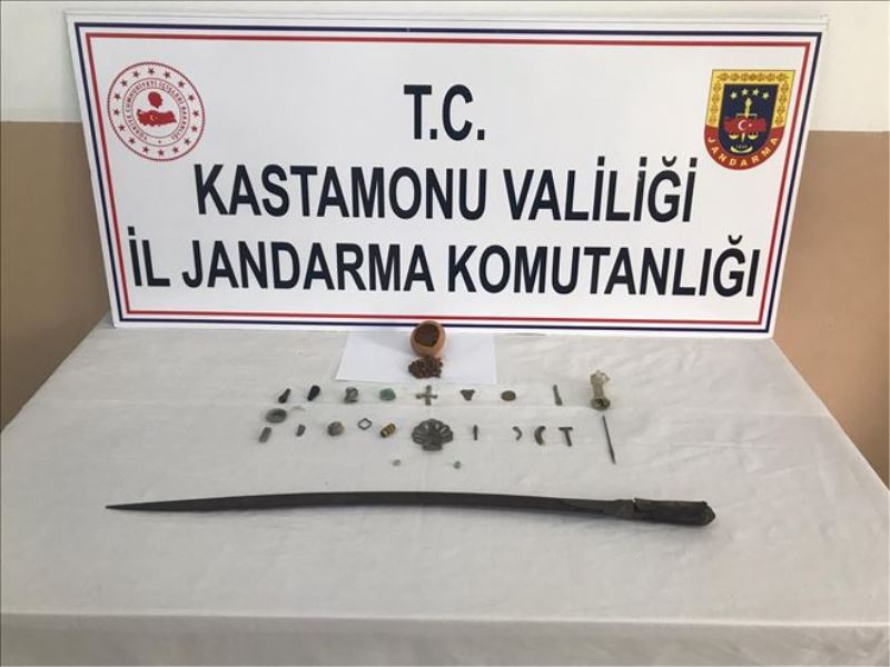 Edinilen bilgiye göre, Kastamonu İl Jandarma Komutanlığı ekipleri tarafından Taşköprü´de ellerindeki arkeolojik eserleri satmak için müşteri aradıkları tespit edilen şahısların ev ve iş yerlerine yönelik operasyon düzenledi. Operasyonda jandarma ekiplerince yapılan aramalarda 1 adet kemik kabzalı kılıç, 1 adet sikke, 1 adet bronz ok ucu, 1 adet madeni iğne, 2 adet gözyaşı şişesi, 1 adet kemer tokası şeklinde metal obje, 1 adet pişmiş toprak küp ve küp içerisinde 50 adet sikke olduğu değerlendirilen obje, 3 adet imame, 1 adet metal istavroz obje, 1 adet yüzük, 6 adet taş obje ve 6 adet tarihi olduğu değerlendirilen metal obje ele geçirildi. Ele geçirilen eserler incelenmesi amacıyla Müze Müdürlüğüne teslim edilirken, yakalanan 2 şüpheli şahıs hakkında da 2863 sayılı Kültür ve Tabiat Varlıklarını Koruma Kanunu´na muhalefet suçundan yasal işlem yapıldı. Olayla ilgili soruşturma devam ediyor.