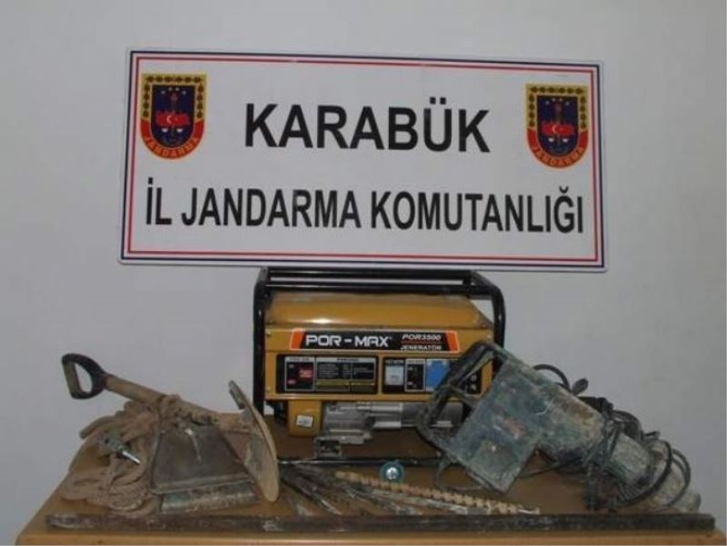 Edinilen bilgiye göre, İl Jandarma Komutanlığı ekipleri yaptıkları istihbari çalışmalar sonucu Safranbolu kırsalında kaçak kazı yapan G.O.E, B.A, Ş.Ü, A.E ve S.Ö`yü suçüstü yaparak gözaltına aldı. Suçüstü yakalanan şahıslarla birlikte kazı yaptıkları alanda bulunan hilti, jeneratör, 6 hitli ucu, 3 kürek, 2 levye, 30 metre uzunluğunda elektrik kablosu ve halata el konuldu.