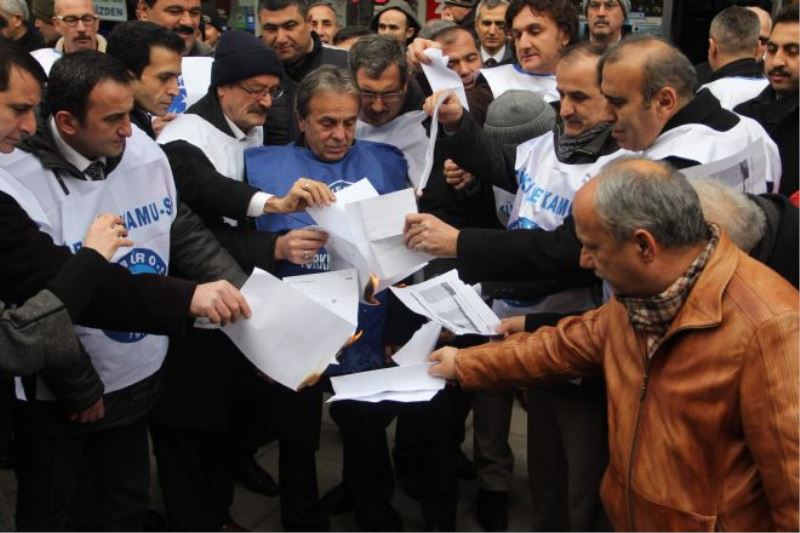 Ünal’ın açıklamasının ardından eyleme katılan sendika yöneticileri ve memurlar maaş bordrolarını yaktı.
