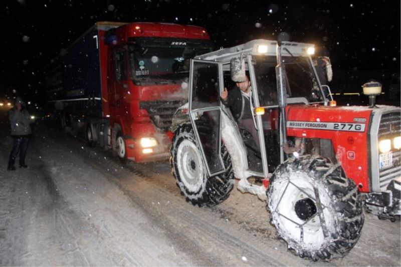 Karabük-Gerede Karayolu Kemikli Rampaları Mevkii`nde kar ve buzlanma nedeniyle ulaşım zaman zaman dururken, yolda kalan TIR’ların imdadına ise traktörler yetişti