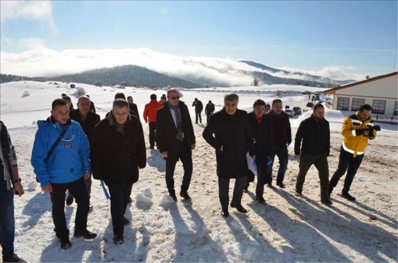 Keltepe Kayak Merkezinde ilk olarak yapım ve montaj çalışmaları tamamlanan ve test aşamalarının devam ettiği Telesiyej´de incelemelerde bulunan Vali Gürel ve protokol üyeleri, Telesiyej ile Alt ve Üst Günübirlik Tesisine çıkarak burada yapılan çalışmalar hakkında Gençlik ve Spor İl Müdürü Abdulkadir Çetin´den bilgiler aldılar.