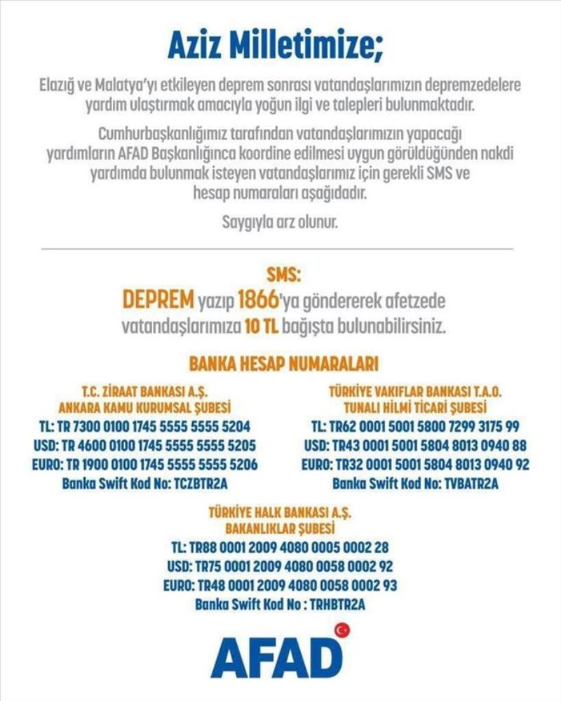 Ayrıca, nakdi yardımda bulunmak isteyen vatandaşlar için de gerekli numaraların yer aldığı duyuruda, şu ifadelere yer verildi: “Elazığ ve Malatya´yı etkileyen deprem sonrası vatandaşlarımızın depremzedelere yardım ulaştırmak amacıyla yoğun ilgi ve talep bulunmaktadır. Cumhurbaşkanlığımız tarafından vatandaşlarımız tarafından yapacağı yardımların AFAD başkanlığınca koordine edilmesi uygun görüldüğünde nakdi yardımda bulunmak isteyen vatandaşlarımız için gerekli SMS ve hesap numaraları aşağıdadır.