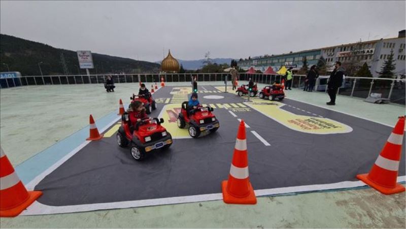 Karabük-Kastamonu karayolu üzerinde bulunan bir alışveriş merkezinin bahçesine kurulan mobil trafik eğitim aracıyla çocuklar trafik güvenliği konusunda bilgilendirildikten sonra akülü araca bindirilerek trafikte uymaları gereken kurallar anlatıldı.