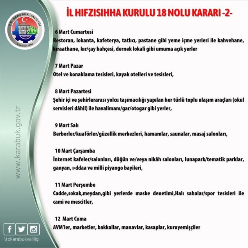 Alınan bu kararlara uymayanlara 1593 sayılı Umumi Hıfzıssıhha Kanunu´nun 282. maddesi gereği ve 5326 sayılı Kabahatler Kanunu´nun 32. Maddesi gereğince idari para cezası ve konusu suç teşkil eden davranışlara ilişkin Türk Ceza Kanununun 195 inci maddesi kapsamında gerekli adli işlemlerin uygulanmasına; karar verilmiştir.” denildi.