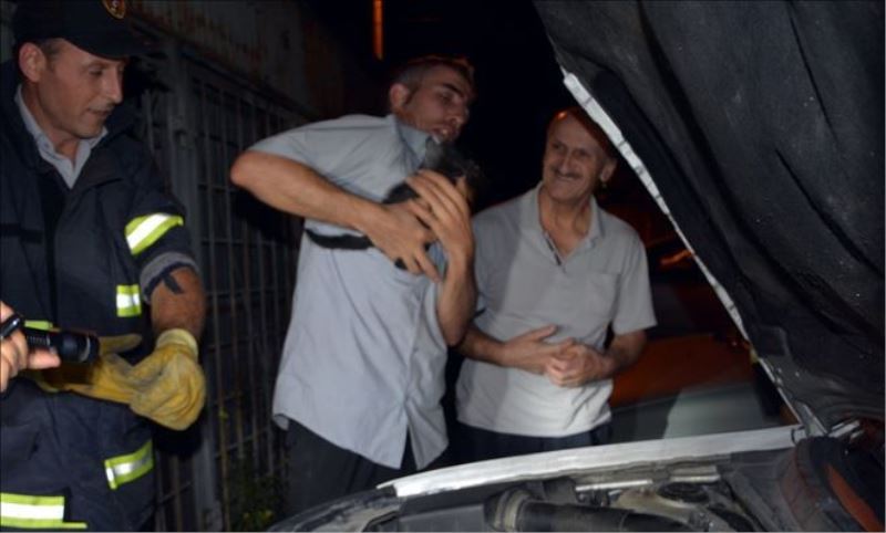 Karabük´te park halindeki otomobilin motor bölümde sıkışan yavru kedi, polis ve itfaiye ekiplerince kurtarıldı