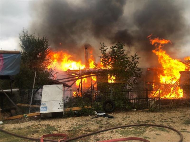Ekipler tarafından söndürülen yangında ahşap iki katlı ev ve ambar tamamen yanarak kullanılamaz hale geldi.