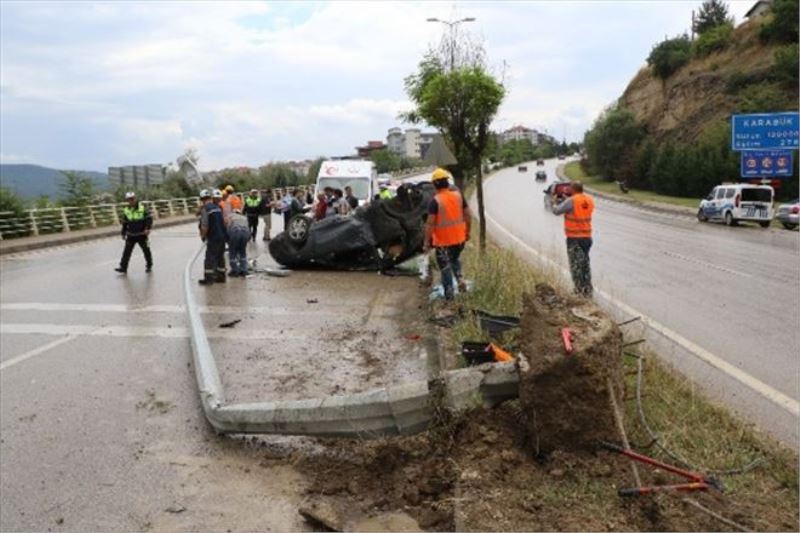 Edinilen bilgiye göre, kazalardan biri Safranbolu - Karabük karayolu Kireçkuyusu mevkiinde meydana geldi. Safranbolu´dan Karabük istikametine giden Erdal Özcan (32) yönetimindeki 78 SU 416 plakalı otomobil henüz belirlenemeyen bir nedenle refüje çarparak takla attıktan sonra ters devrildi. Kazayı göre diğer sürücüler 112 sağlık ekiplerine ve polise haber verdi. Kazada yaralanan otomobil sürücüsü Özcan, ambulansla hastaneye kaldırıldı. Otomobilin çarparak devirdiği aydınlatma direği de ekipler tarafından kaldırıldı.