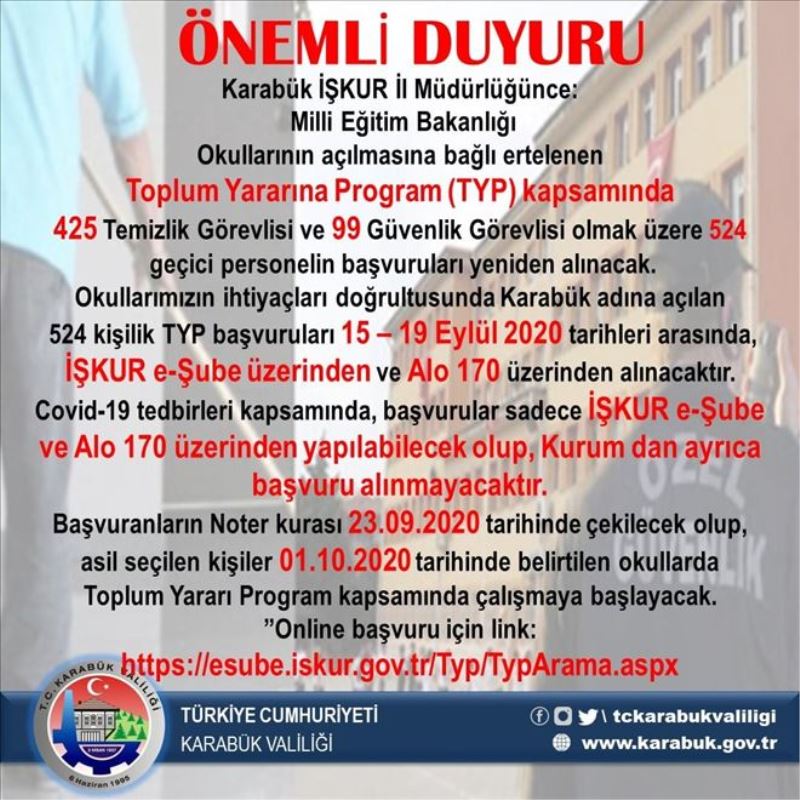 İl Milli Eğitim Müdürlüğü kanaatleri ve okulların ihtiyaçları doğrultusunda Karabük adına açılan 524 kişilik TYP başvuruları bugün itibari ile başladı. Başvurular İŞKUR E-Şube üzerinden ve Alo 170 üzerinden alınırken, Covid-19 tedbirleri kapsamında kurum üzerinden başvuru yapılamayacak.