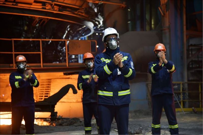 Sağlık Bakanı Fahrettin Koca´nın koronavirüs´le mücadele eden sağlık çalışanları için 3 gün saat 21.00´da vatandaşları alkış tutmaya davet etmesinin son gününde KARDEMİR´de çalışan işçilerden de destek geldi. Dördüncü yüksek fırında 1450 ila 1500 derece arasında akan sıvı ham çeliğin karşısında toplanan işçiler sağlık çalışanlarına 1 dakika boyunca alkış tutarak teşekkür etti.