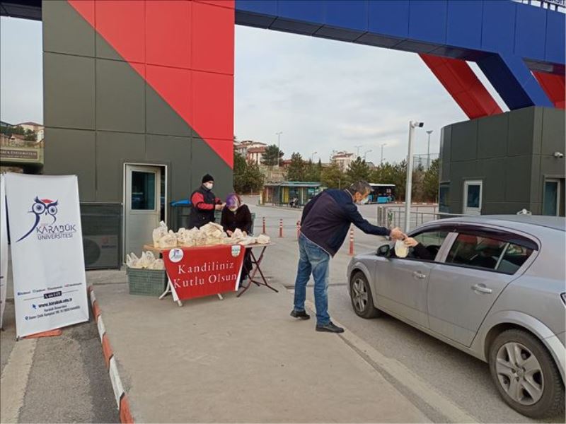 Karabük Üniversitesi giriş kapısında derslere başlayan öğrencilere ve akademisyenlere Miraç Kandili münasebetiyle KBÜ Sağlık ve Spor Daire Başkanlığı tarafından kandil simidi dağıtıldı.