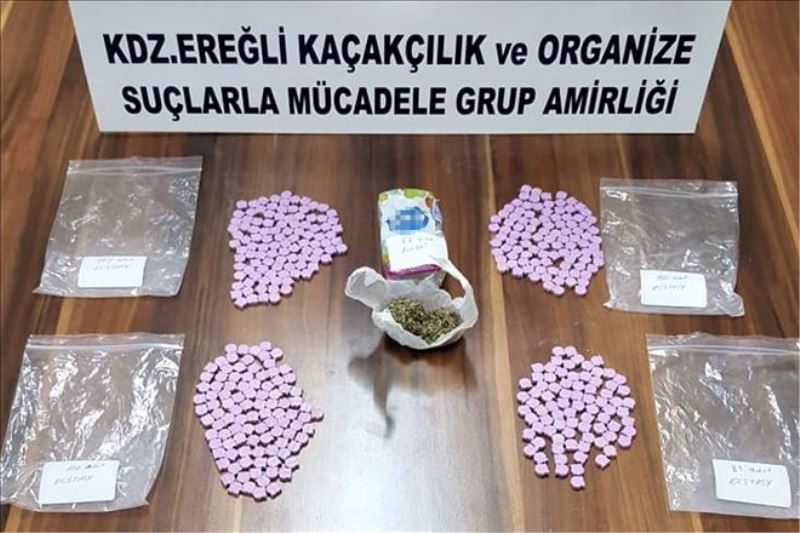 Edinilen bilgiye göre, Kdz. Ereğli İlçe Emniyet Müdürlüğüne bağlık Kaçakçılık ve Organize Suçlarla Mücadele (KOM) Büro Amirliği ekipleri bir süredir takip ettikleri ve başka suçlardan kaydı bulunan B.Y. (26) ile K.B.´ye (23) operasyon düzenledi. Kullandıkları 54 KG 728 plakalı aracı durduran polis ekipleri, hem araçta hem de şüphelilerin üzerlerinde yaptıkları aramada 386 adet uyuşturucu hap ile 8,8 gram bonzai diye tabir edilen madde ele geçirdi. Gözaltına alınan şüphelilerden birinin yaralama, diğerinin ise cinsel suçtan kaydı bulunduğu öğrenildi.