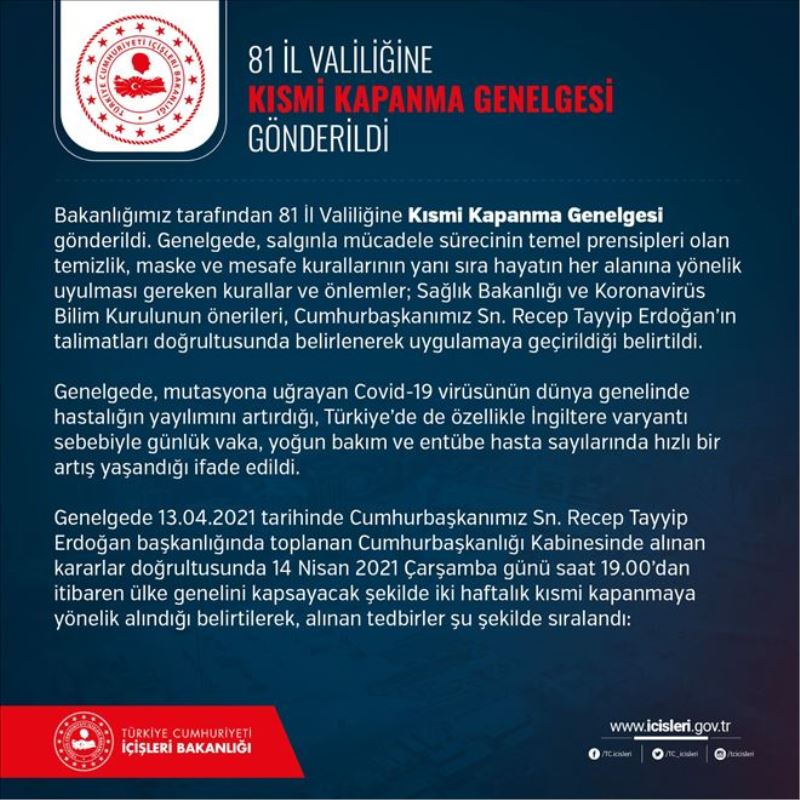 Genelgede 13.04.2021 tarihinde Cumhurbaşkanı Recep Tayyip Erdoğan başkanlığında toplanan Cumhurbaşkanlığı Kabinesinde alınan kararlar doğrultusunda 14 Nisan 2021 Çarşamba günü saat 19.00´dan itiba-ren ülke genelini kapsayacak şekilde iki haftalık kısmi kapanmaya yönelik alındığı belirtildi.