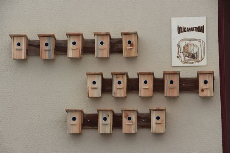 Çankırı´da kuşların soğuktan etkilenmemesi için bina şeklinde 14 farklı yuva yapan öğrenciler, düzenli olarak yuvalara yem bırakıyor.