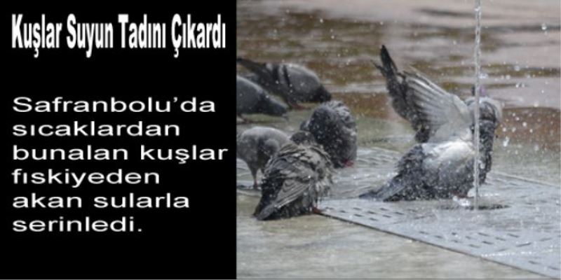 Safranbolu’da dün yaşanan 20.8 derecelik sıcaktan bunalan kuşlar Safranbolu Belediyesi tarafından Misak-ı Milli Meydanında yaptırılan süs fıskiyelerinde serinledi. Kanatlarını açarak adeta yıkanan kuşlar, suyun tadını doyasıya çıkardılar. Meydanda oturan vatandaşlarda aldıkları yemlerle kuşları beslerken, çocuklar ise kuşlarla eğlendi.